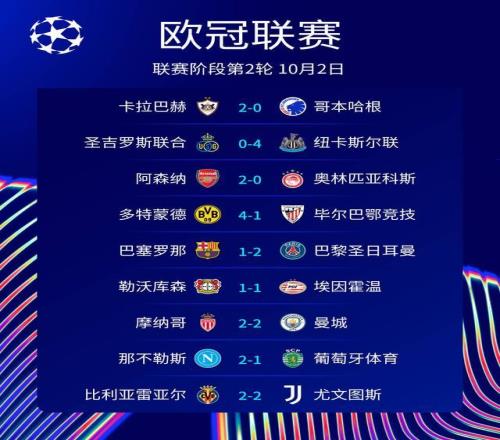 至此,本賽季歐冠聯(lián)賽階段第2輪的第2天9場較量戰(zhàn)罷,結(jié)果分別為:卡拉巴赫2-0哥本哈根、圣吉羅斯聯(lián)合0-4紐卡斯爾聯(lián)、阿森納2-0奧林匹亞科斯、多特蒙德4-1畢爾巴鄂競技、巴塞羅那1-2巴黎圣日耳曼、勒沃庫森1-1PSV埃因霍溫、摩納哥2-2曼城、那不勒斯2-1葡萄牙體育、比利亞雷亞爾2-2尤文圖斯。