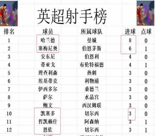 射手榜方面,哈蘭德8球領(lǐng)跑,塞梅尼奧6球位列第2,安東尼和蒂亞戈4球并列第3。凱塞多今天打入一球后,追上恩佐,薩爾,?;倏?,理查利森等人3球剛好擠入前十。