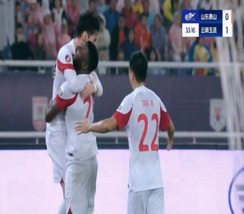 第33分鐘,云南玉昆再次打出精彩反擊,奧斯卡戲耍洛佩斯,將球送到后點,侯永永頭球破門,0:1!山東泰山占盡優(yōu)勢的情況下,意外落后了。