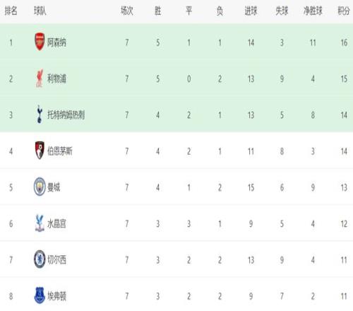 在積分榜上,阿森納以16分高居榜首。利物浦15分排名第2。第3的是熱刺,拿到14分。伯恩茅斯這匹大黑馬也是14分,排名第4。曼城慢慢追了上來,4勝1平2負(fù),拿到13分,排名第5。第6的是水晶宮,拿到12分。切爾西以11分排第7。而曼聯(lián)的戰(zhàn)績是3勝1平3負(fù),排名掉到第10。