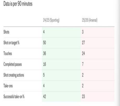 在葡萄牙,他常常通過帶球沖擊后衛(wèi)來折磨他們,場均超過4次“向前推進盤帶”。而在阿森納至今,他場均只有1次向前推進盤帶。