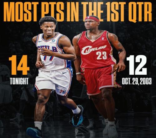 沒有人能預(yù)料到,埃奇庫姆的NBA首秀會(huì)如此“不講理”。比賽開始前,外界討論的焦點(diǎn)還是“缺少喬治的76人能否頂住凱爾特人攻勢”“恩比德的健康狀態(tài)是否影響發(fā)揮”,但第一節(jié)比賽打完,所有話題都被一個(gè)名字取代——埃奇庫姆。9投5中拿下14分,這個(gè)數(shù)字直接打破了勒布朗?詹姆斯保持了22年的“NBA新秀首秀單節(jié)最高分”紀(jì)錄(12分),要知道,當(dāng)年詹姆斯的首秀已經(jīng)被視為“天選之子”的宣言,而埃奇庫姆只用一節(jié)就完成了超越,成為這一記錄的歷史第一人。