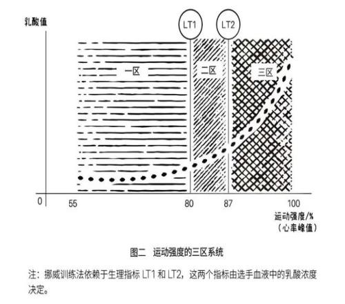 與世界上大多數(shù)耐力訓(xùn)練采用的五區(qū)劃分方式不同,挪威訓(xùn)練法是簡單的三區(qū)劃分,即有氧閾值之下的輕松區(qū)、無氧閾值之上的強度區(qū),以及兩個閾值之間的混合區(qū)(圖一)。