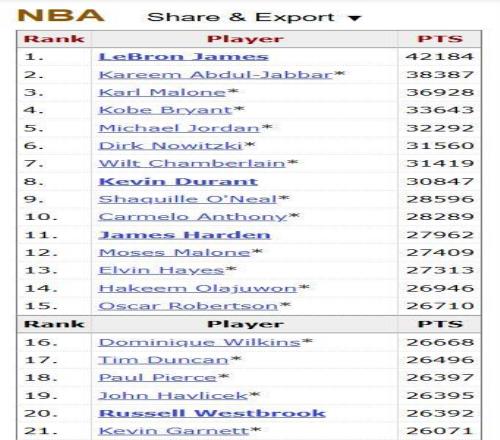 此役過后,威少在NBA歷史得分榜上連續(xù)超越綠軍兩位名宿哈弗里切克和保羅-皮爾斯升至歷史第18位。目前排在威少身前的是馬刺傳奇蒂姆-鄧肯。